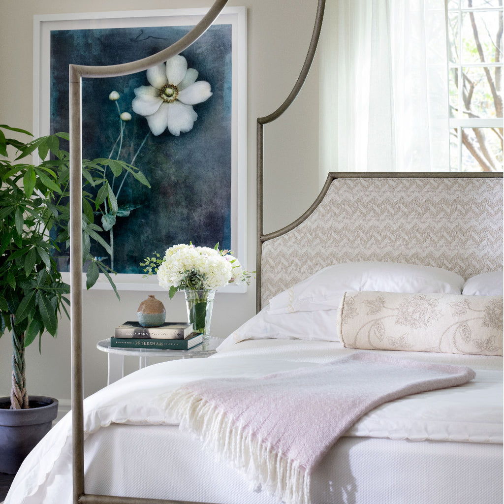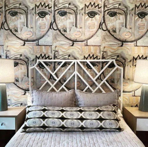 We love the idea of a painted wrought iron bed with a bamboo inspired aesthetic. Pair it with an unexpected art inspired backdrop for a boldly modern look.